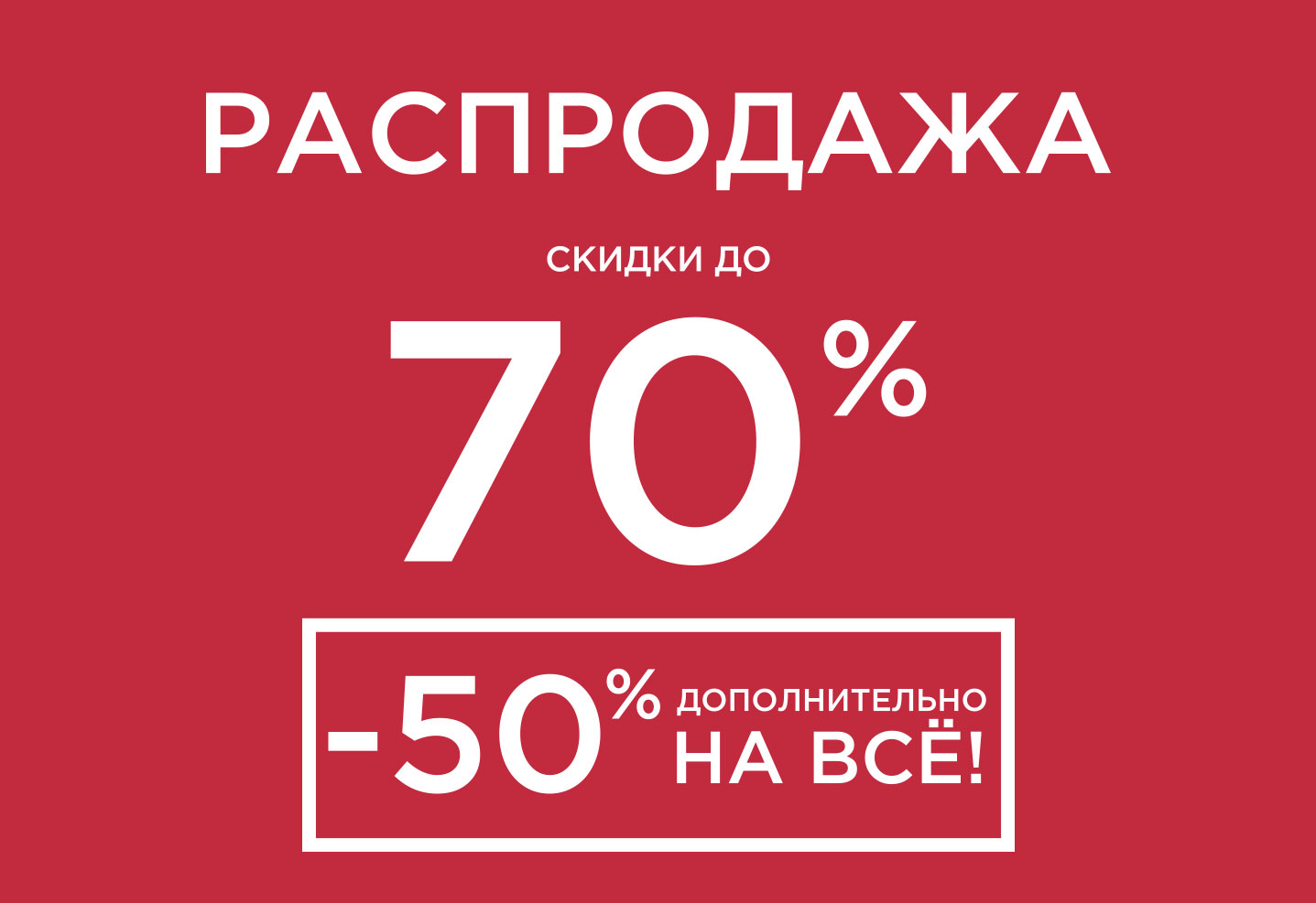 РАСПРОДАЖА + ДОПОЛНИТЕЛЬНАЯ СКИДКА!Время выгодного шопинга, тем более сейчас, когда в магазинах помимо распродажи до 70% действует дополнительная скидка 50% на ВЕСЬ ассортимент мужской и женской коллекции. Быстрее за покупками! Ждем вас в магазинах Network!Адреса магазинов